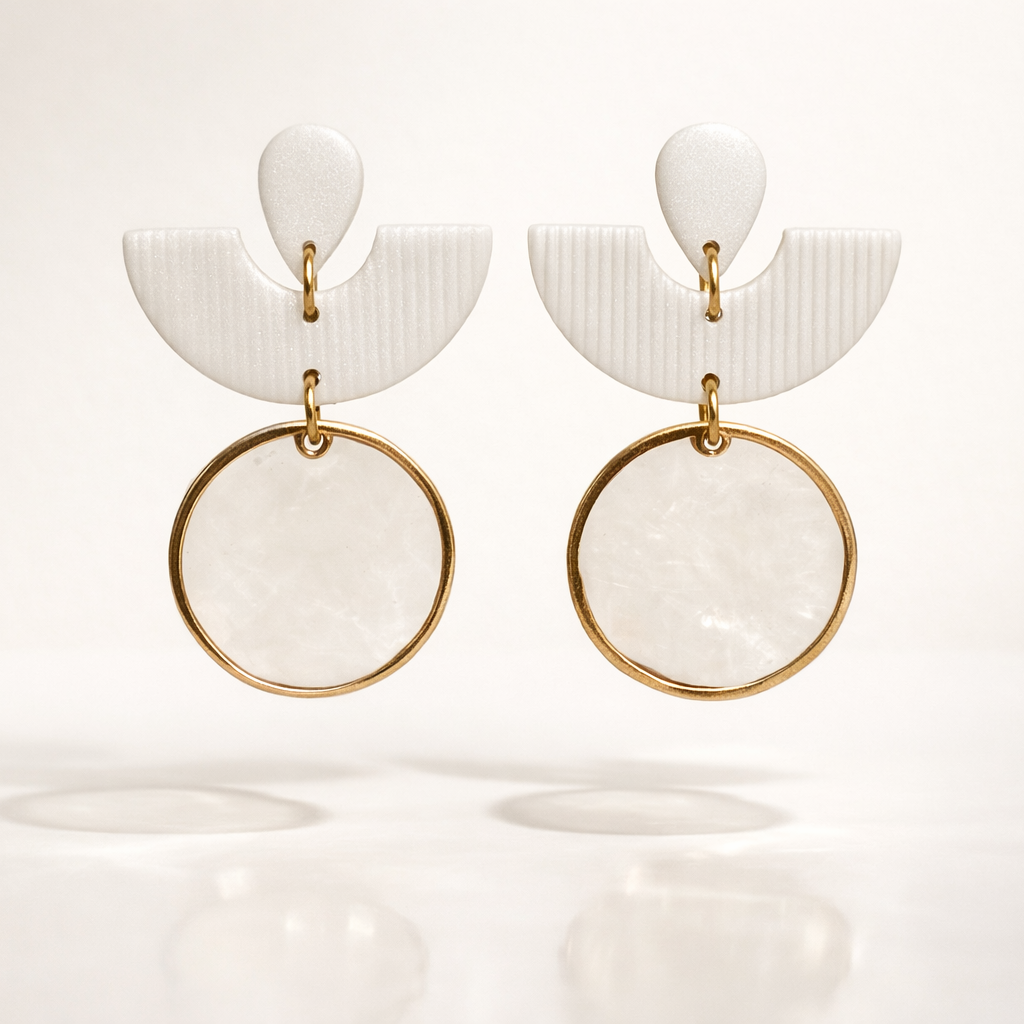 Light and organic, Breeze captures the movement of sea air with pearl clay teardrop studs and a textured ivory arch. Finished with a natural shell pendant, it’s a modern nod to coastal beauty.