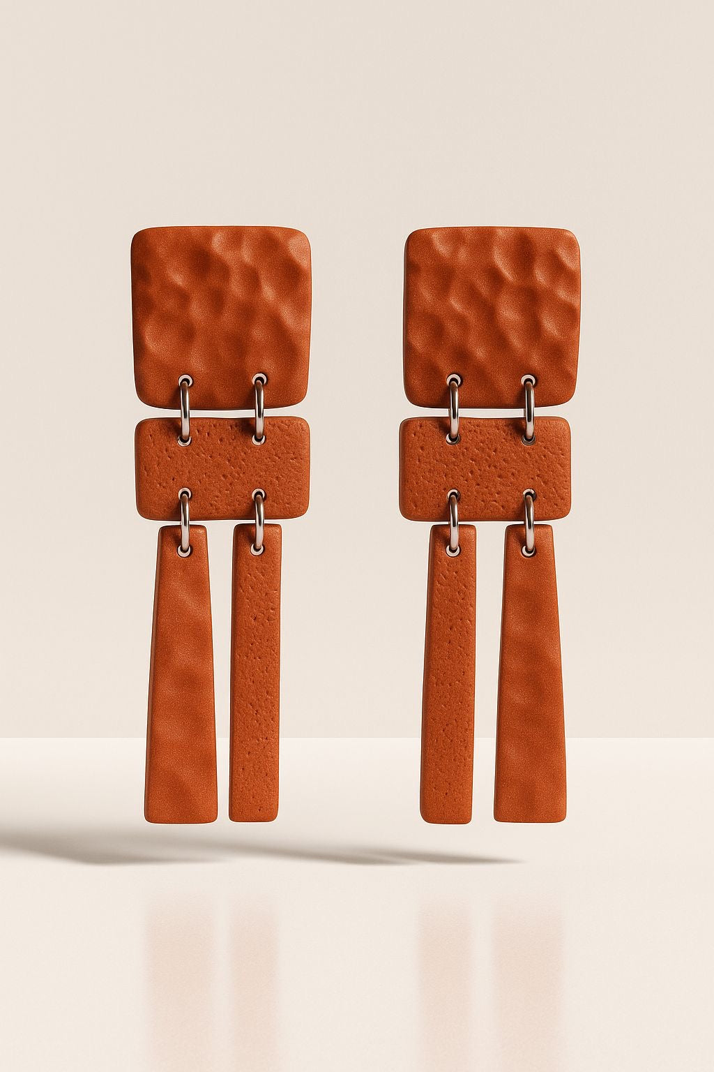 The square stud sits directly on the ear, bringing bold canyon energy, while the asymmetrical terracotta charms create soft, natural movement — a balance of strength and fluidity.