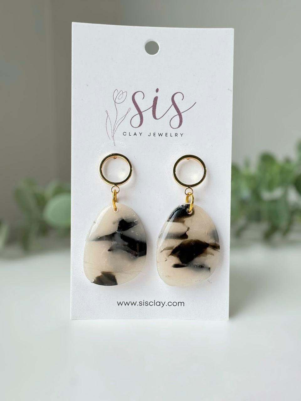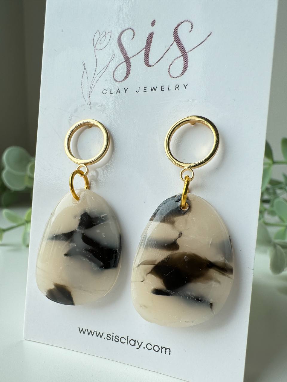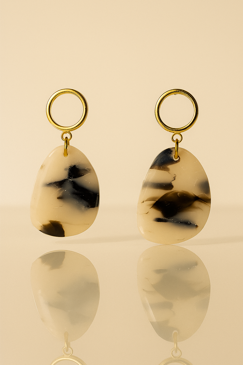 Sleek and sculptural, Charm features an organic silhouette marbled in translucent and black clay, sealed with glossy resin for a refined finish. A round, open gold-filled post anchors the design, adding a delicate contrast to the bold form. A modern piece with a timeless edge.