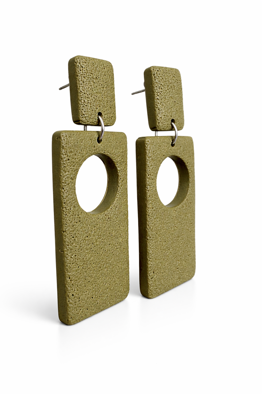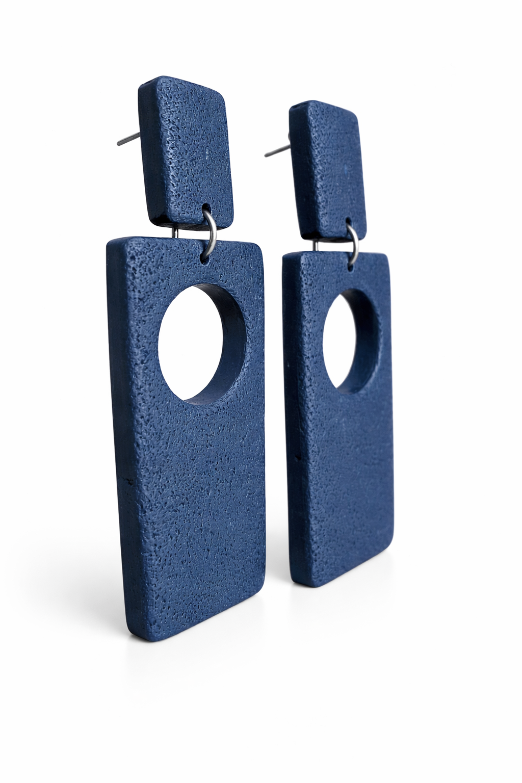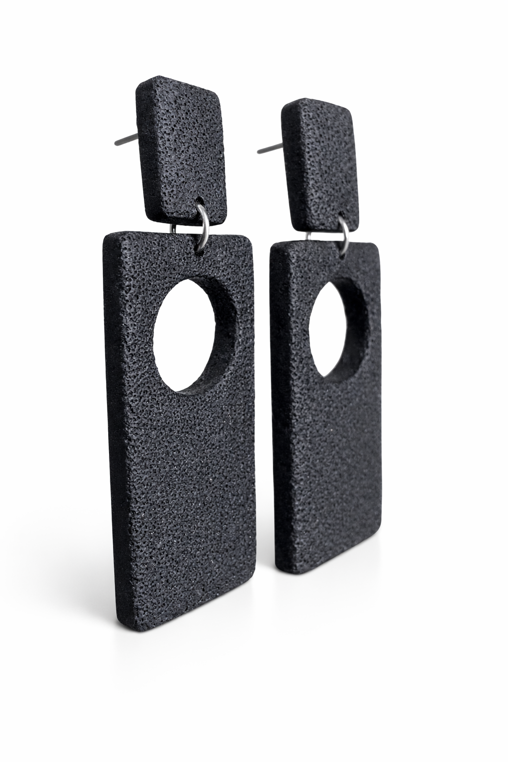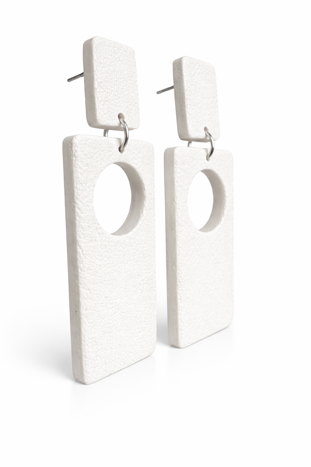 Crafted in polymer clay with limestone texture, it pairs naturally with tailored silhouettes — straight or oversized blazers, precise shirts, structured vests, and clean, architectural trousers.