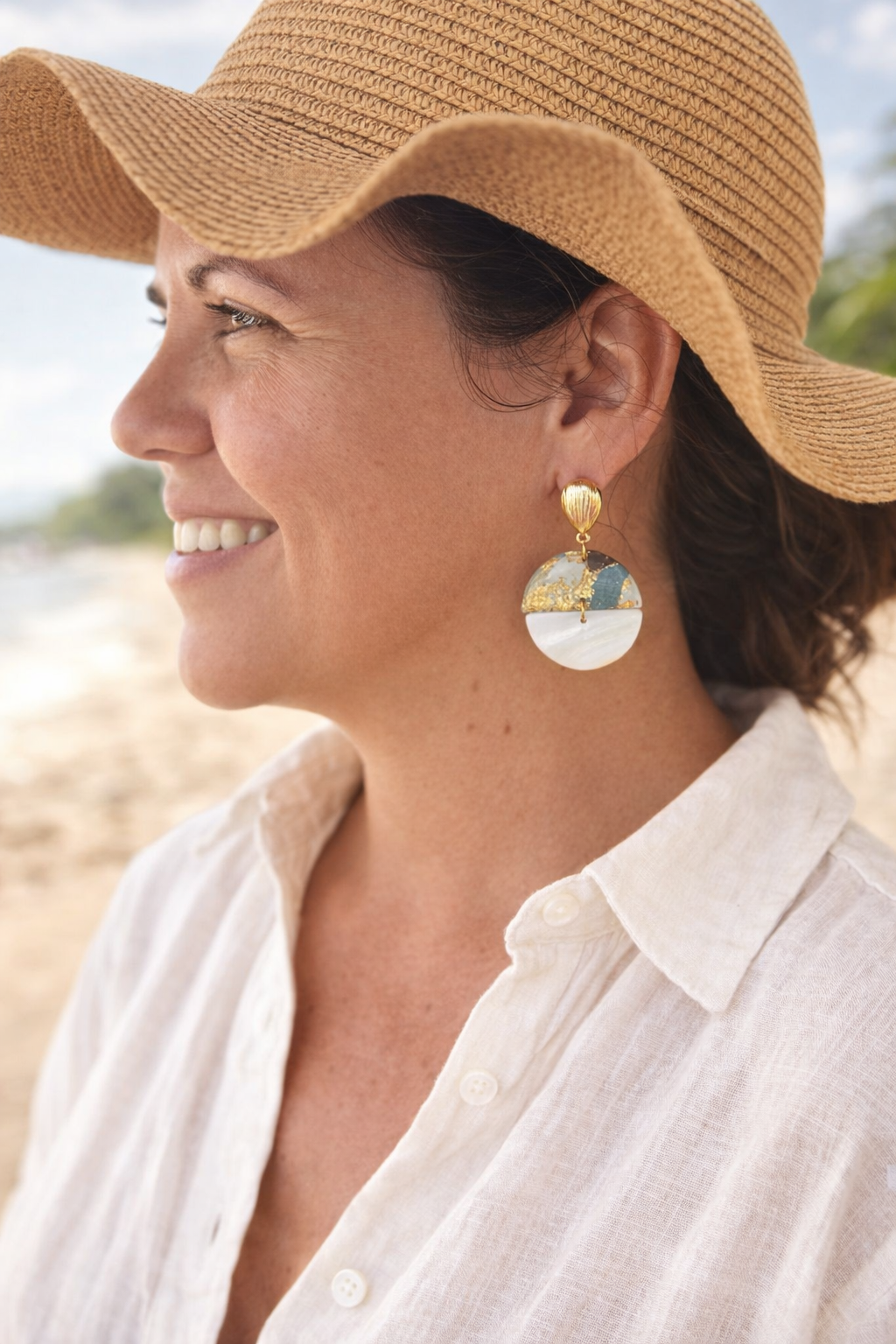Earthy and fluid, Dune features a marbled clay design in swirling shades of blue, pearl, brown, and gold foil. The semi-circle top connects to a smooth mother-of-pearl accent, ending in a full circle pendant for a layered, coastal-inspired silhouette.