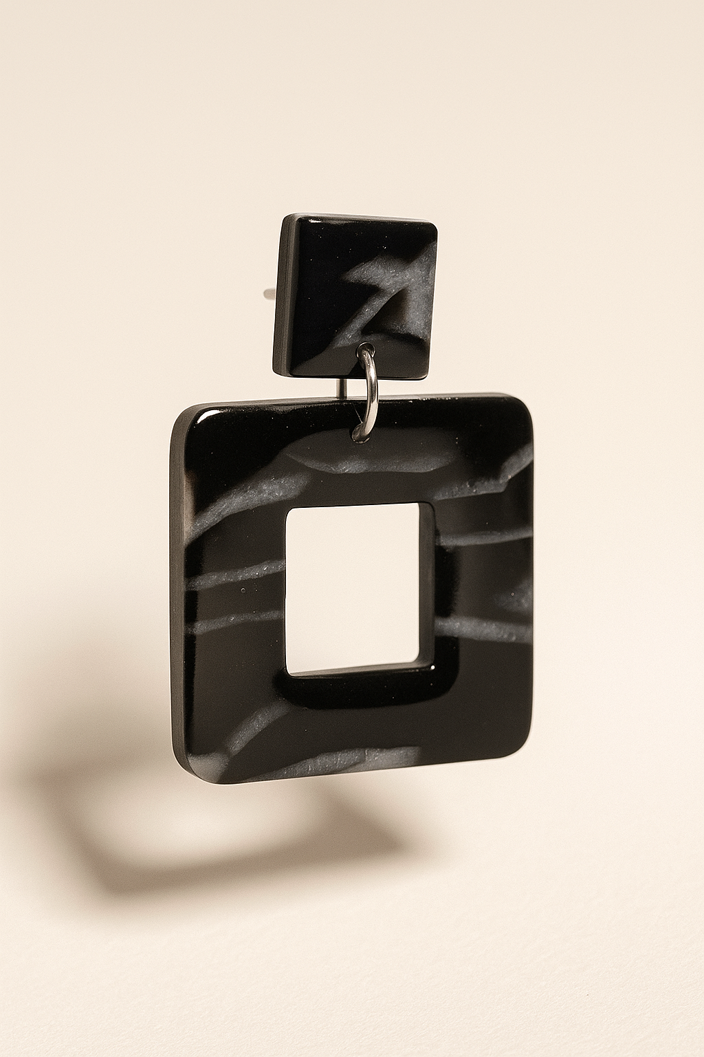 Bold and architectural, Frame features a square cut-out silhouette crafted from a mix of translucent off-white and black clay. The swirling pattern is sealed with a glossy resin finish, adding depth and shine to its structured form.