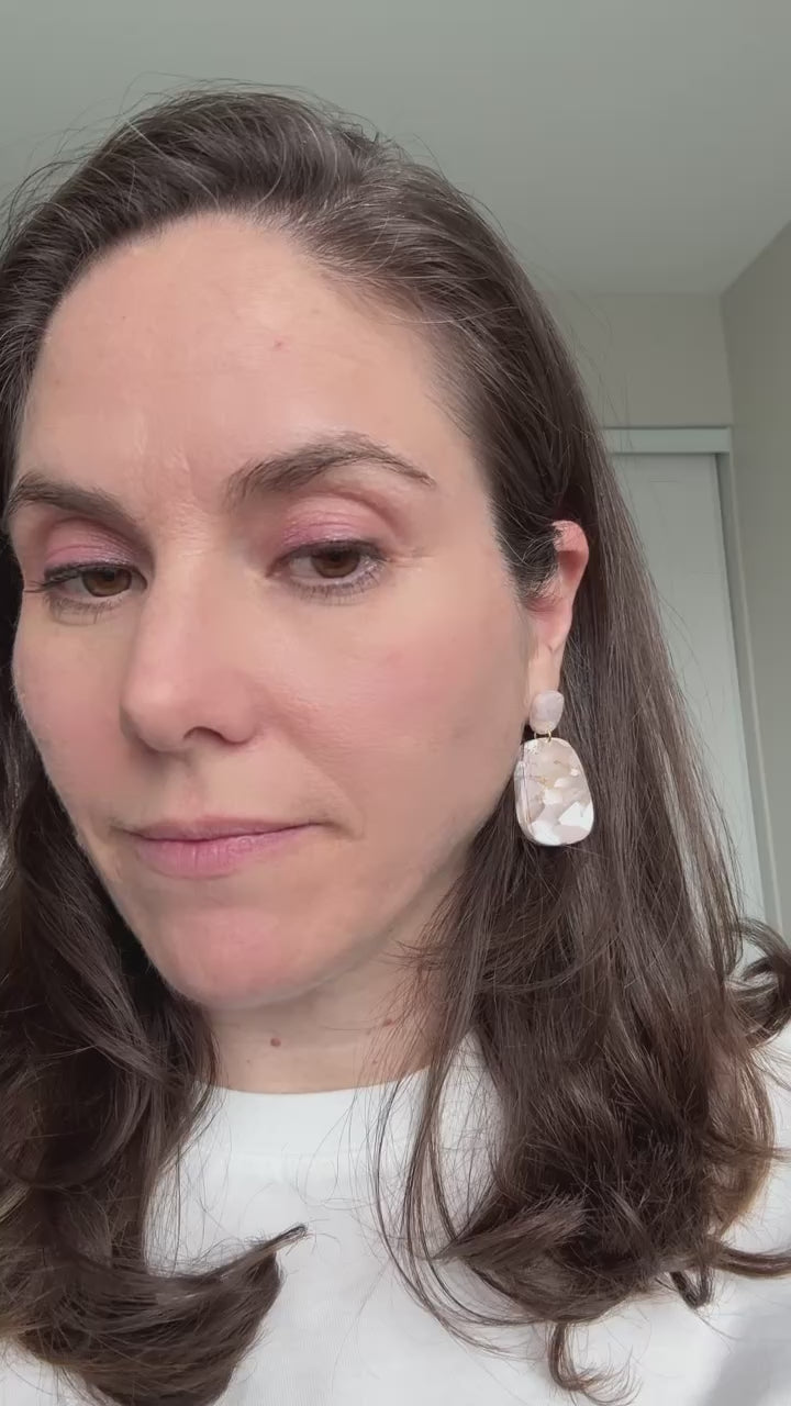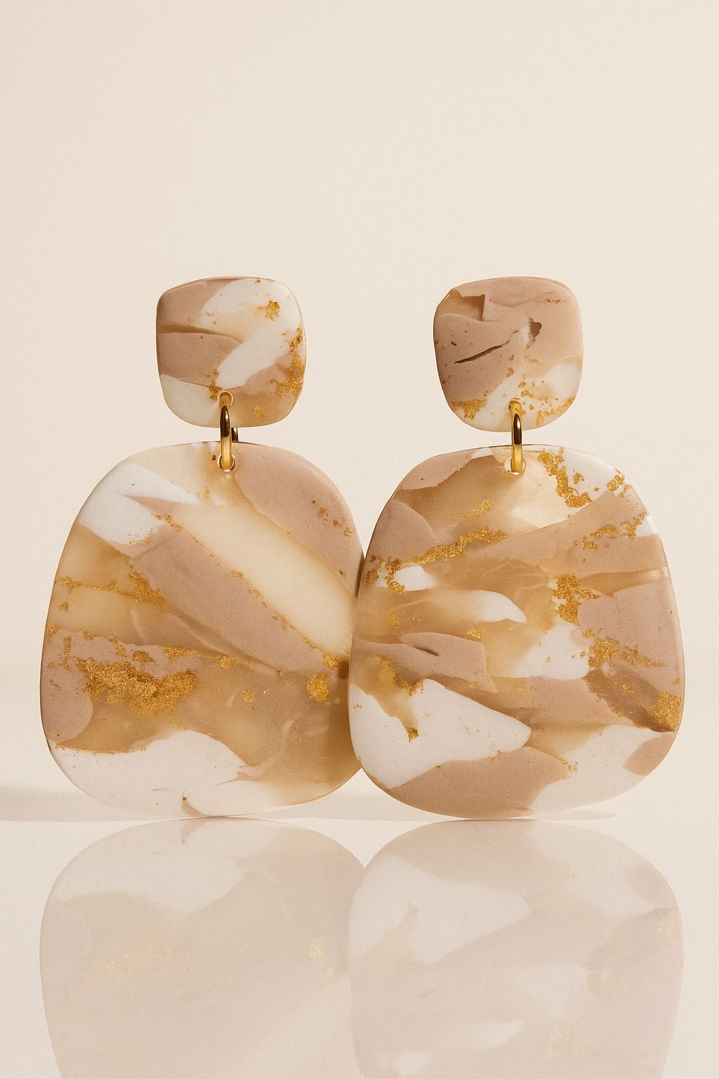 Soft and striking, Halo features an organic silhouette handcrafted in a marbled blend of peach, white, beige, and translucent clay with subtle touches of gold. Lightweight and full of movement, it's a one-of-a-kind piece that adds effortless elegance to any outfit.