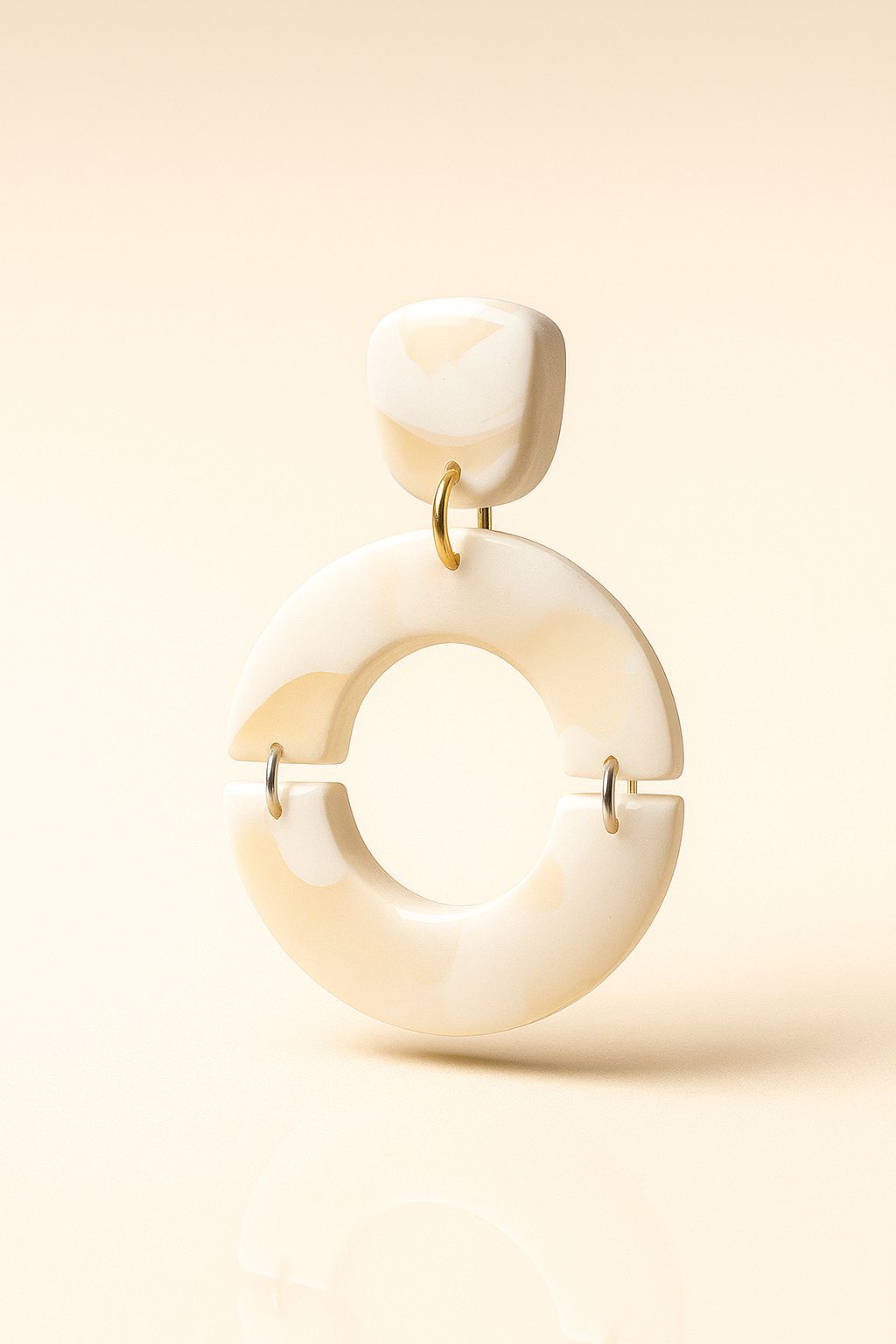 Refined and luminous, Opal features two mirrored semicircles that form a harmonious full-circle design. Made from a delicate blend of translucent and off-white clay, this piece is sealed with a glossy resin finish, creating a soft glow that highlights its clean lines and quiet elegance, connected with silver stainless steel jump rings.