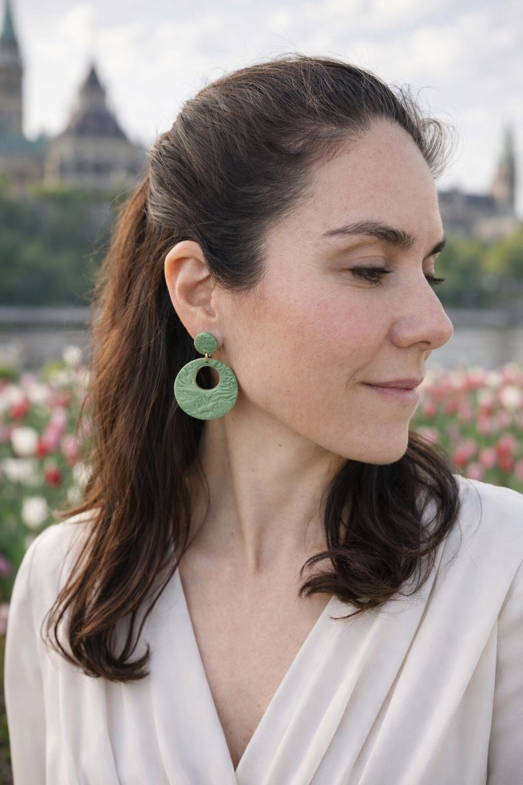 Playful and feminine, The Poppy features a floral-embossed round drop paired with a matching clay stud. Its soft matte finish and botanical texture create a timeless piece that adds a cheerful pop of color to your everyday look.