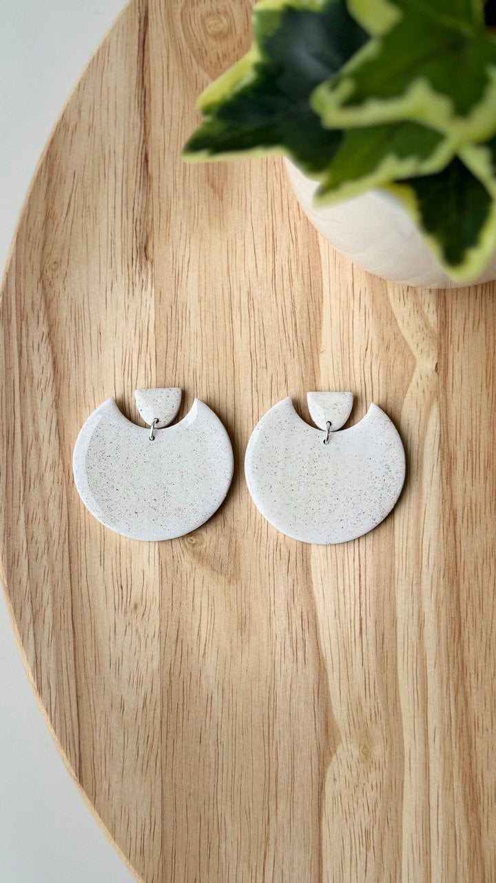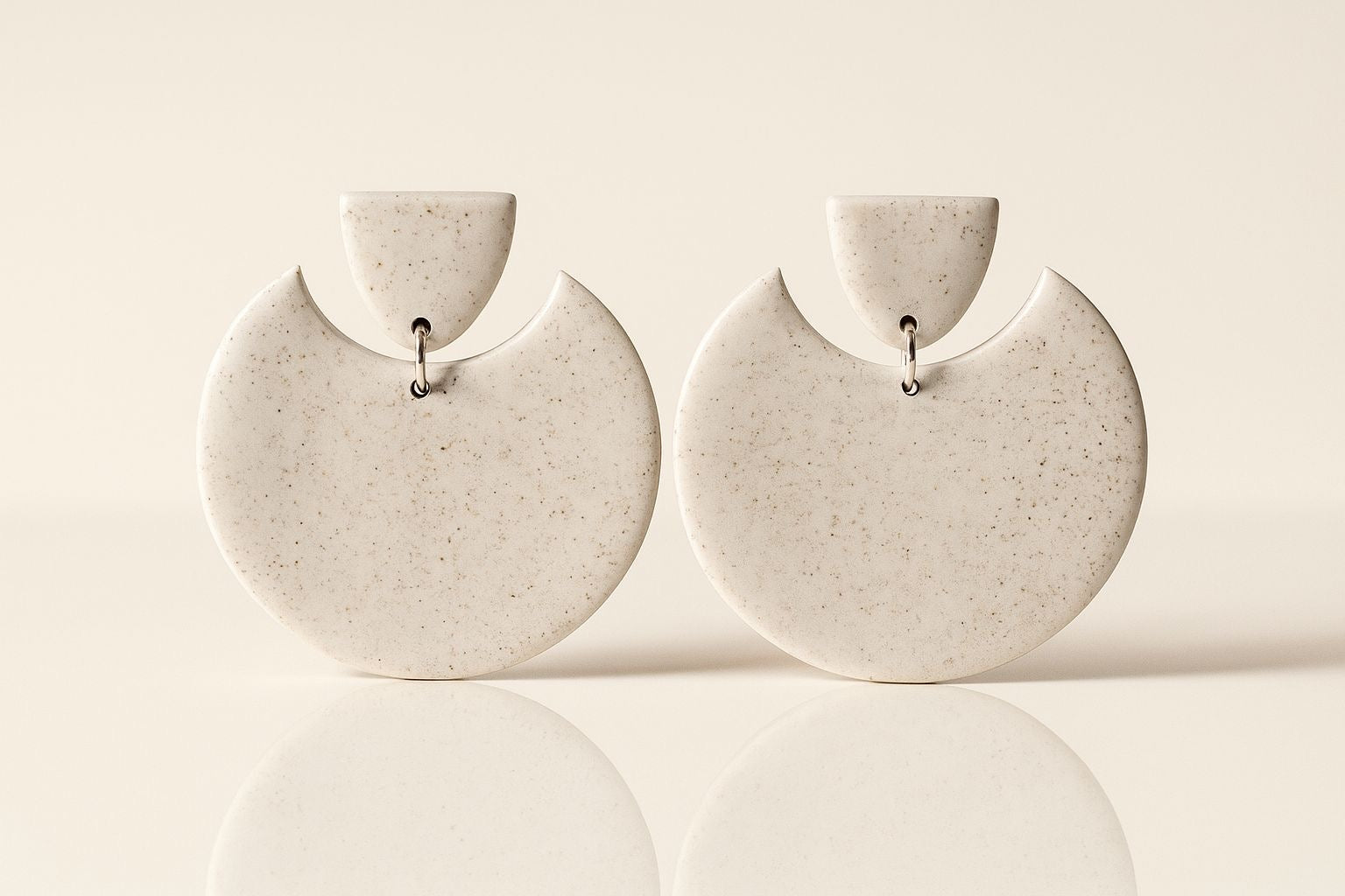 Soft and luminous, Sandy features a pearl-toned clay base infused with real sand and sealed in glossy resin. Its round shape is finished with silver jump rings that add lightness and fluidity to this coastal-inspired piece.