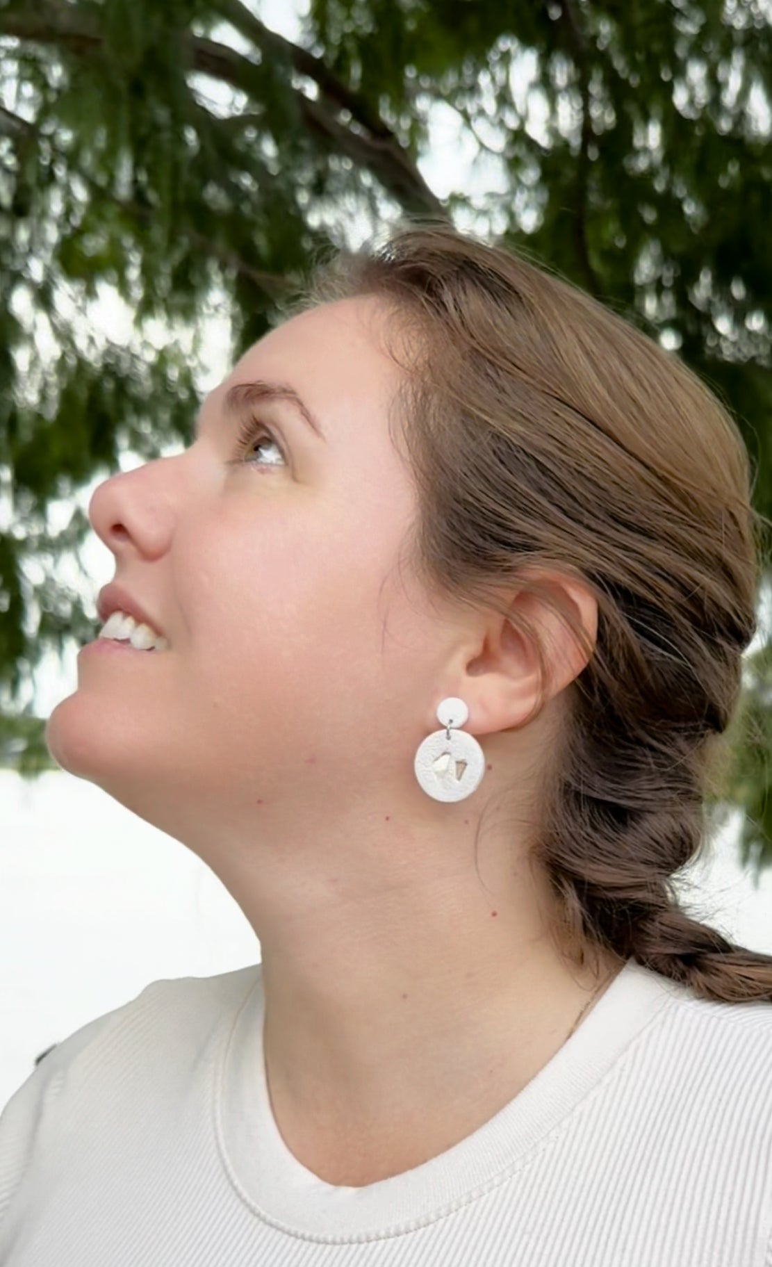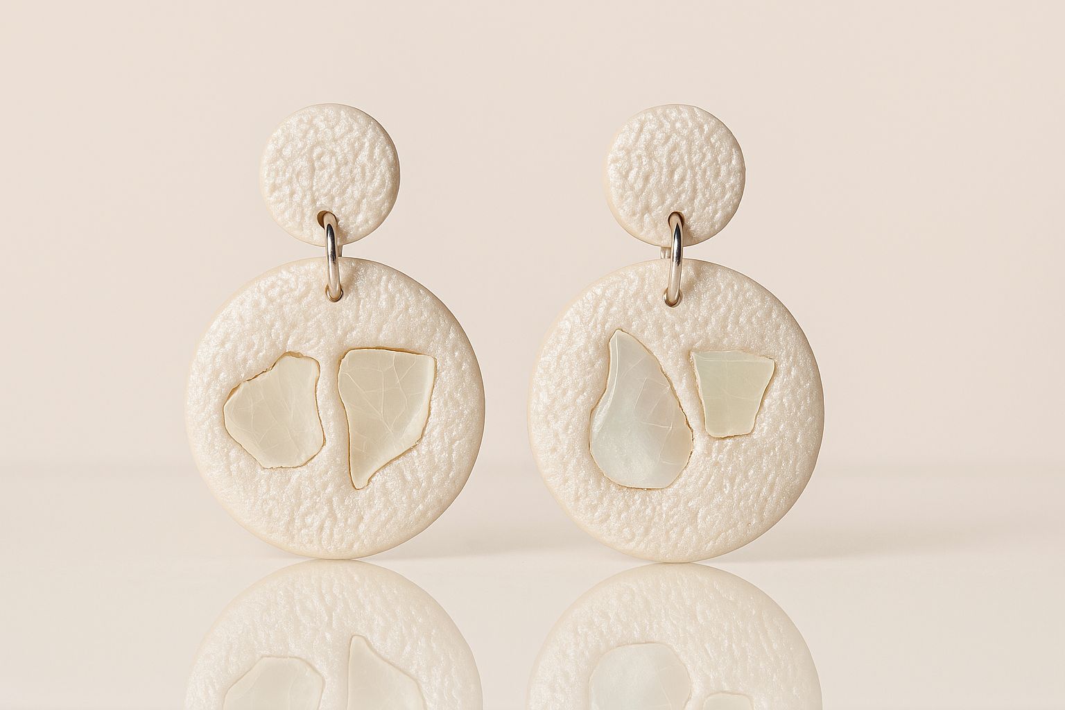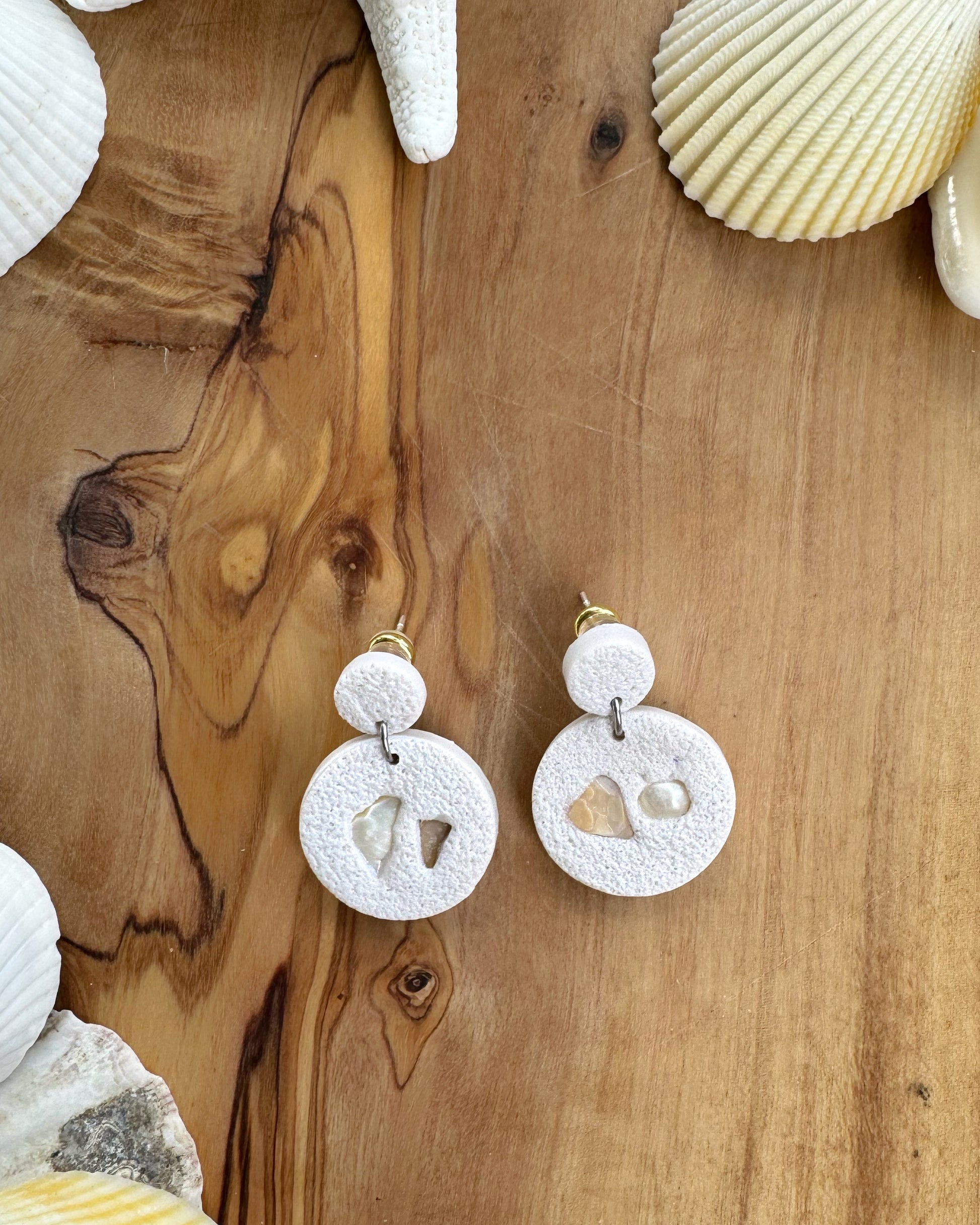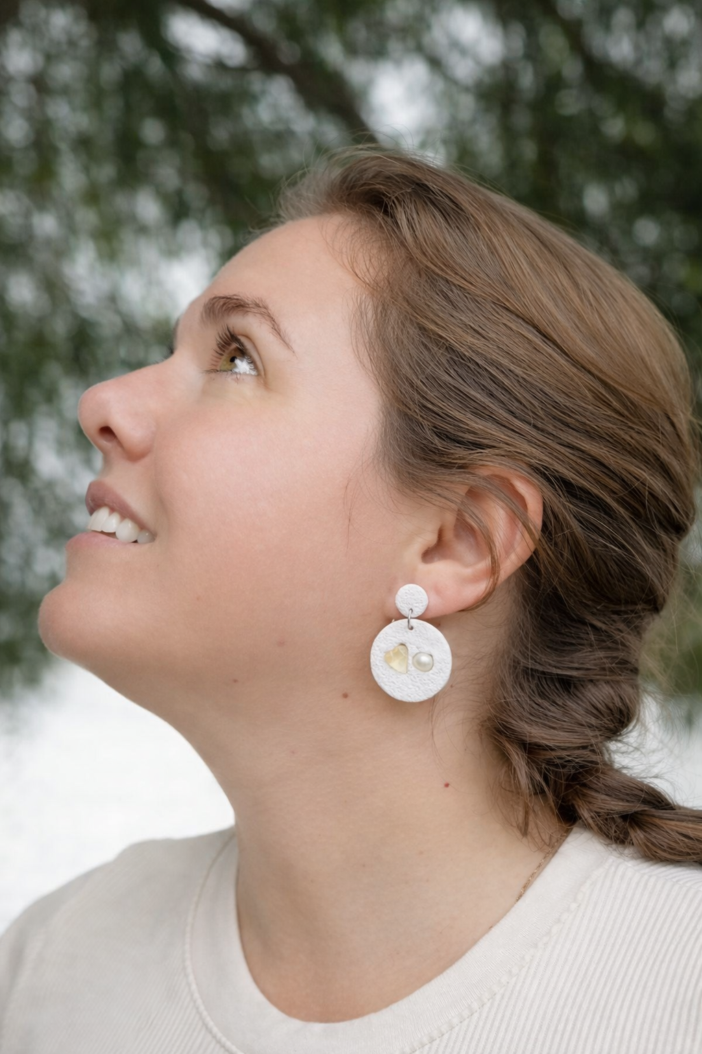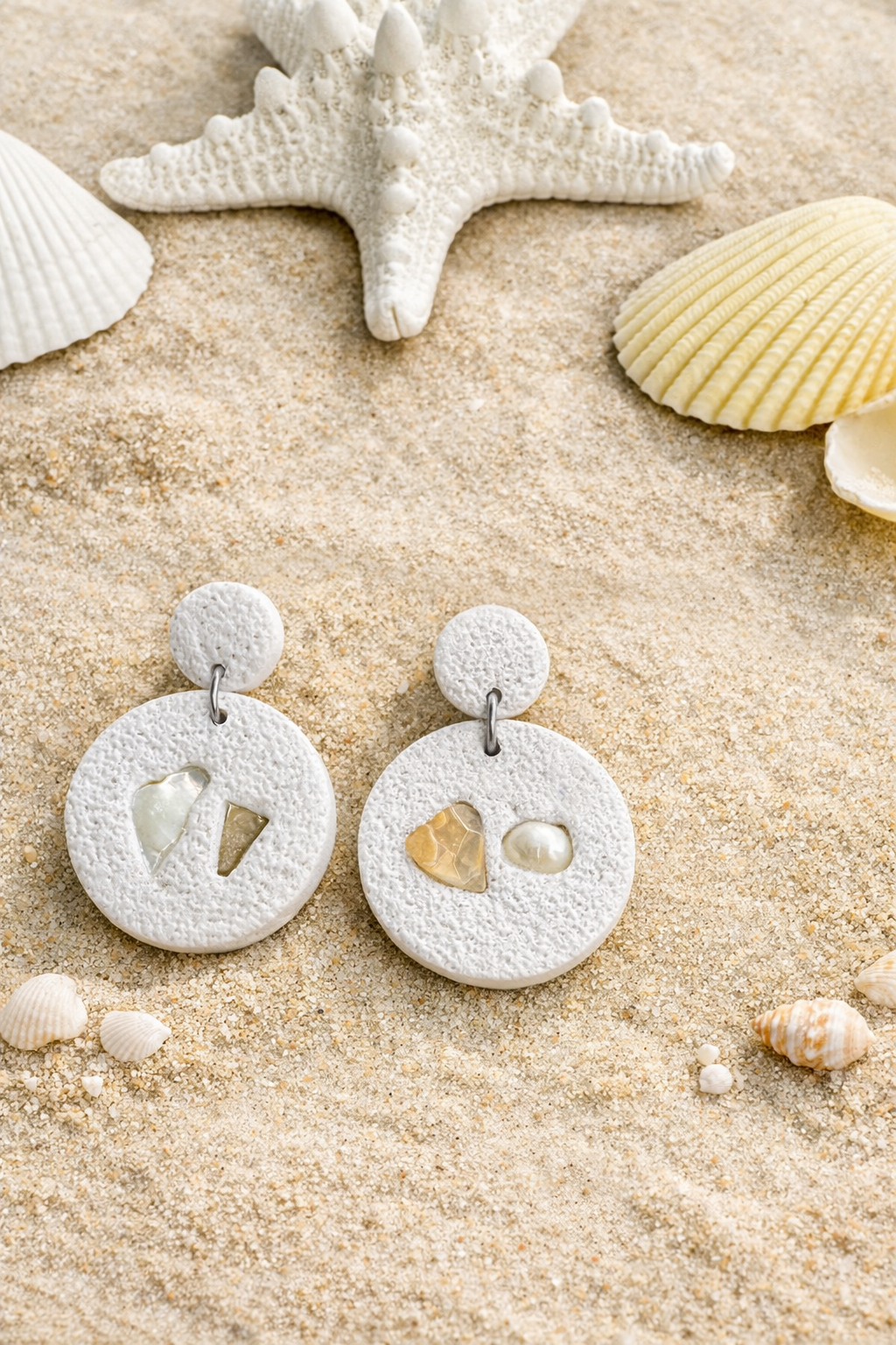 Light and airy, Shell features a pearl-toned circular drop suspended from a matching clay stud with limestone-like texture. Embedded seashell details add an organic, coastal feel to this softly sculpted design. A subtle shimmer completes the piece.
