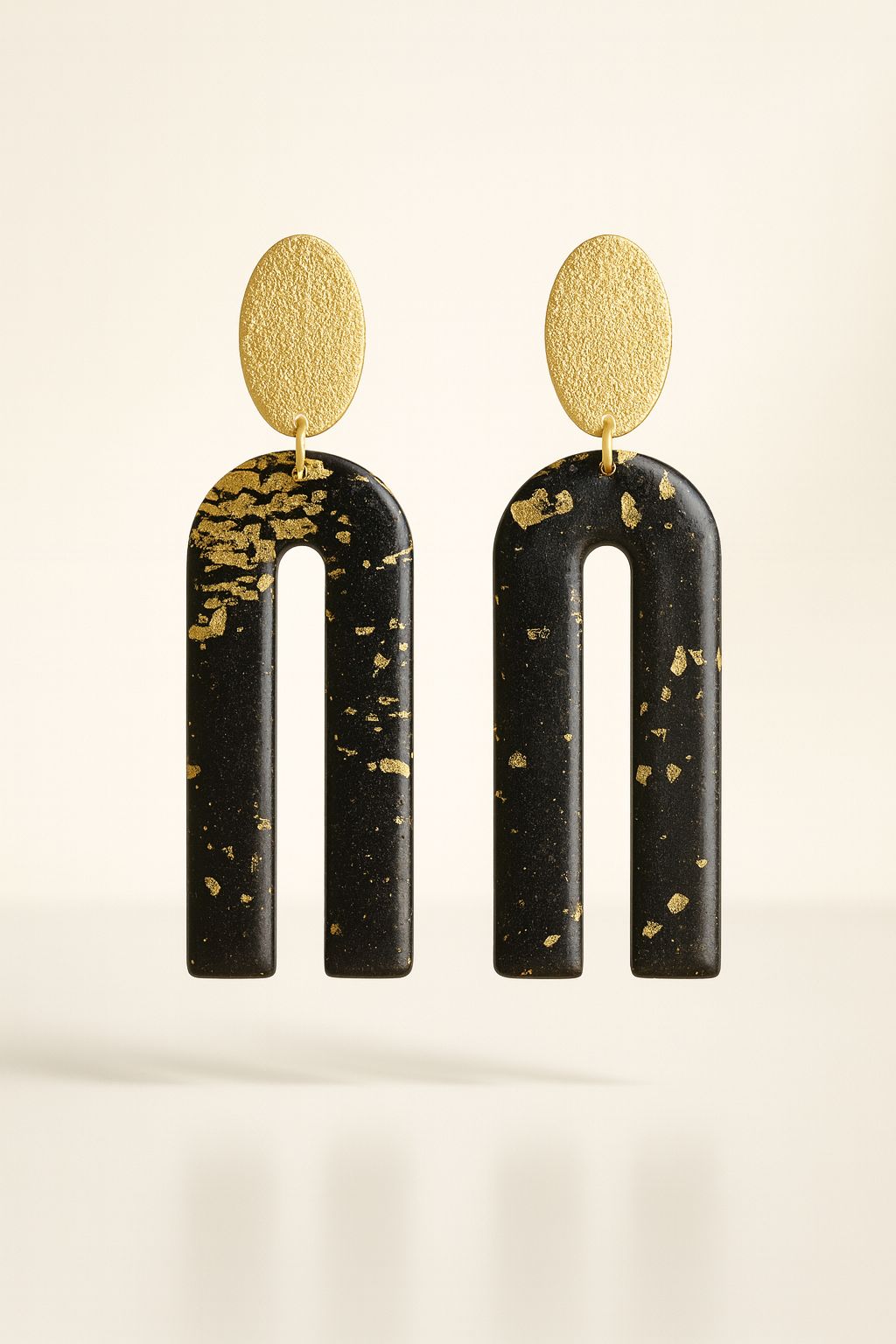 Sleek and sophisticated, the Black Marble Arch features a long, curved silhouette handcrafted in black polymer clay with delicate gold foil woven into a marbled pattern. The contrast between the deep black base and the shimmering metallic accents creates a striking, elevated look.