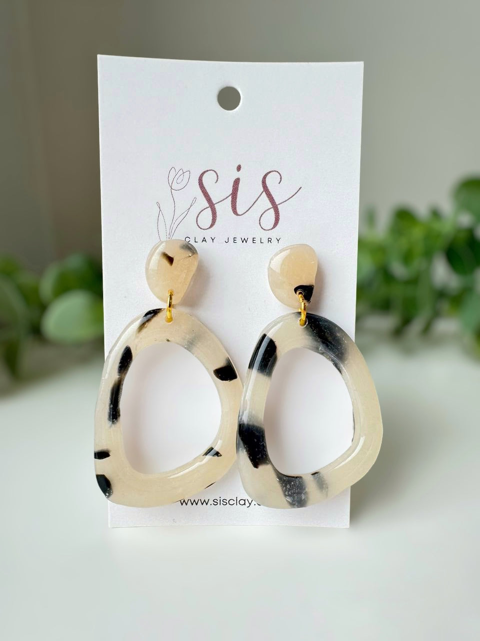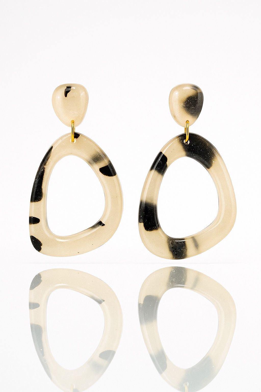 These earrings, made from a combination of polymer clay and resin, have a unique organic shape in translucent and black marble. The classic and modern design adds a touch of sophistication to any outfit. Expertly crafted to make a statement, Muse earrings are the perfect addition to your jewelry collection.